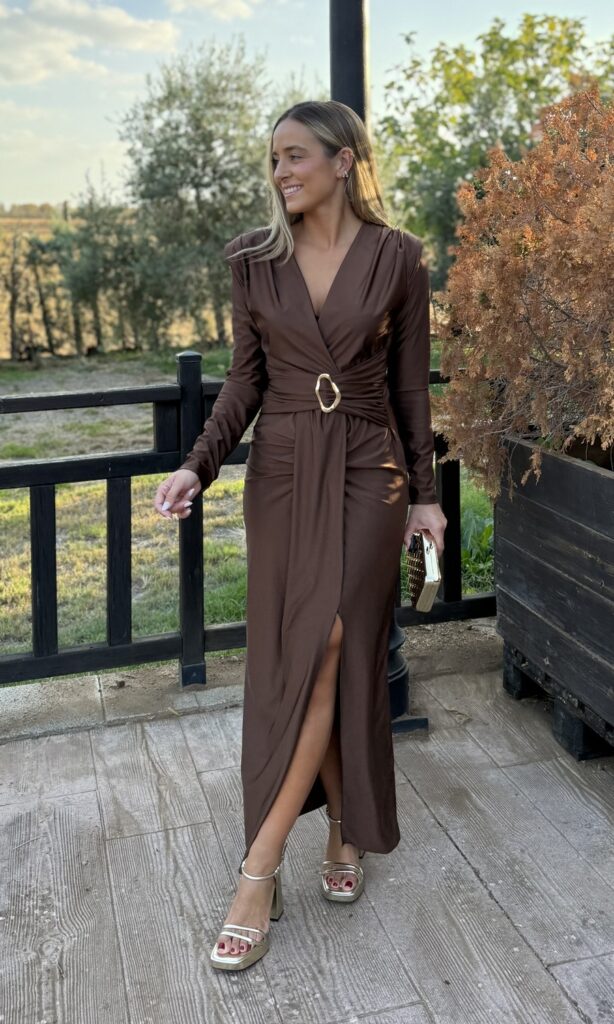 VESTIDO LARGO FRUNCIDO MARRÓN