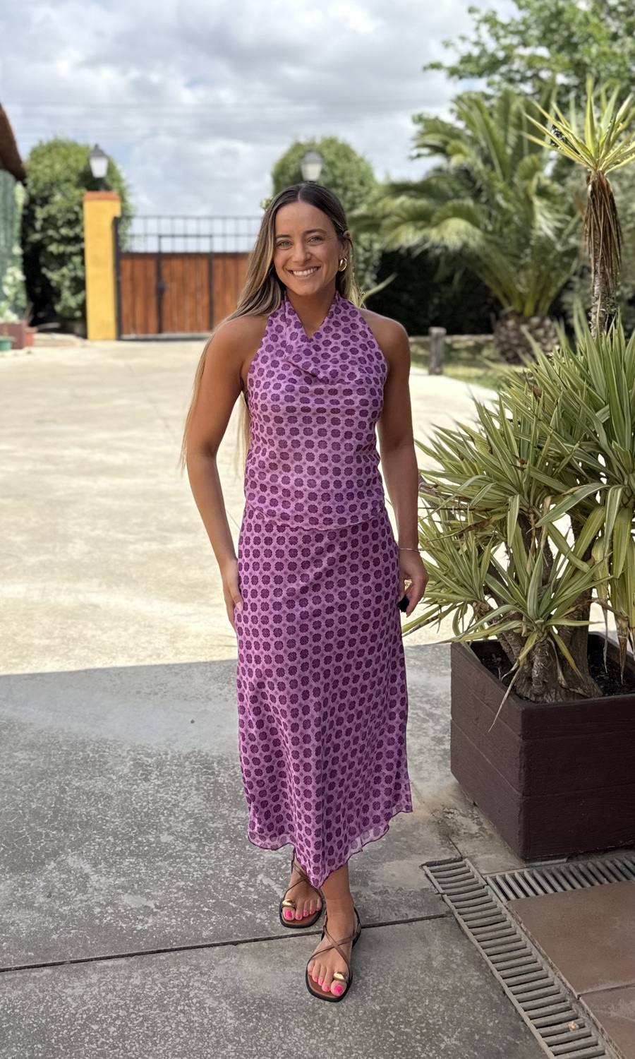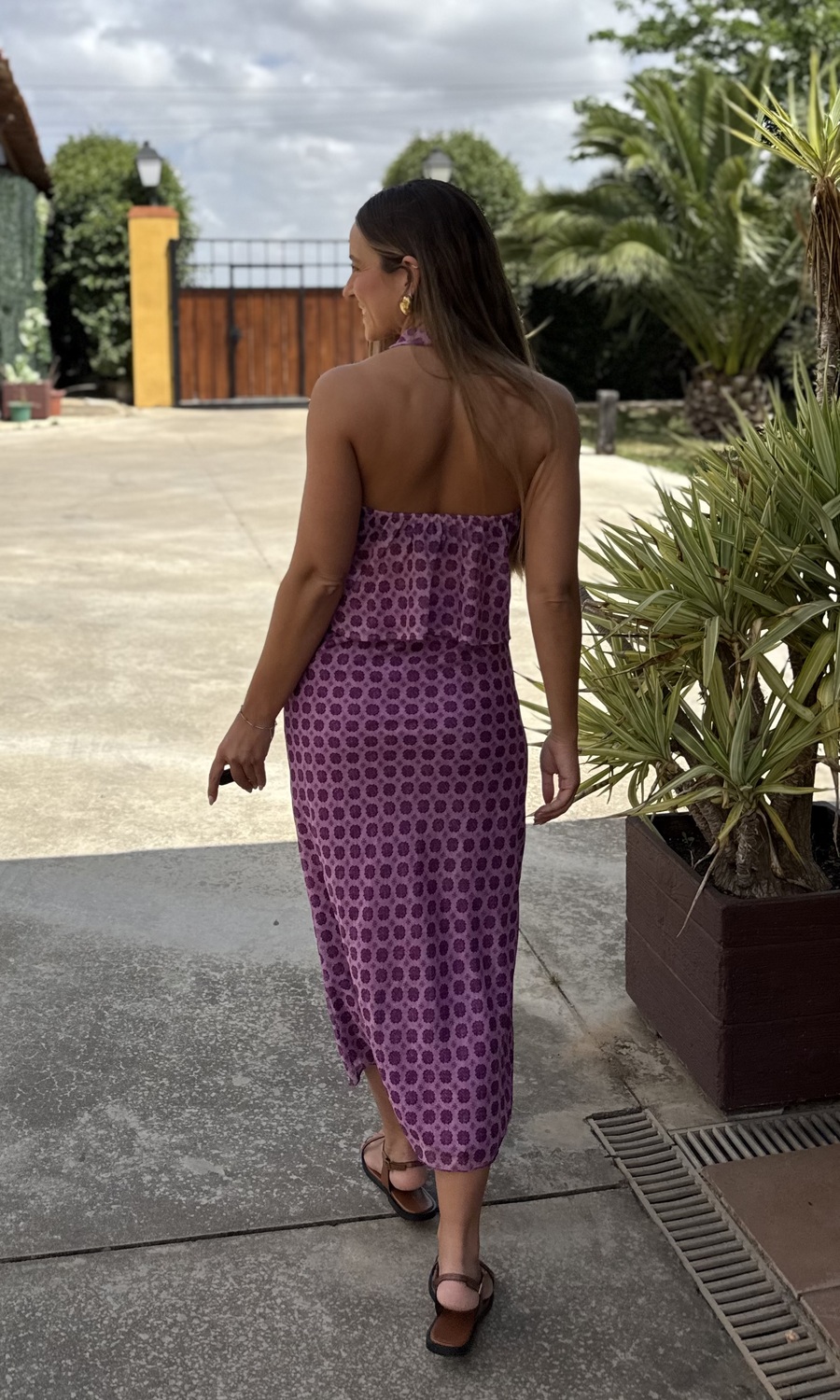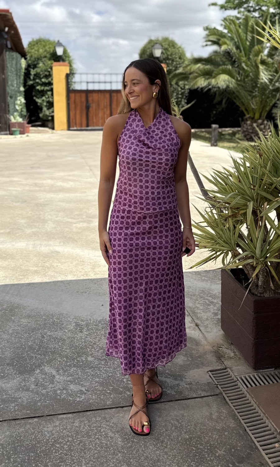 Conjunto de top y falda de gasa. Top cuello halter. La falda mide de largo 90 cm (aproximadamente).