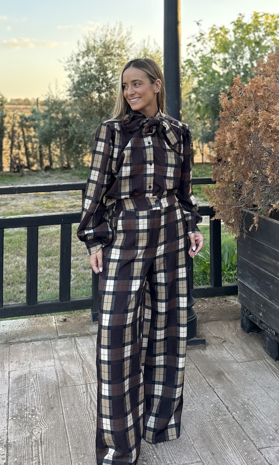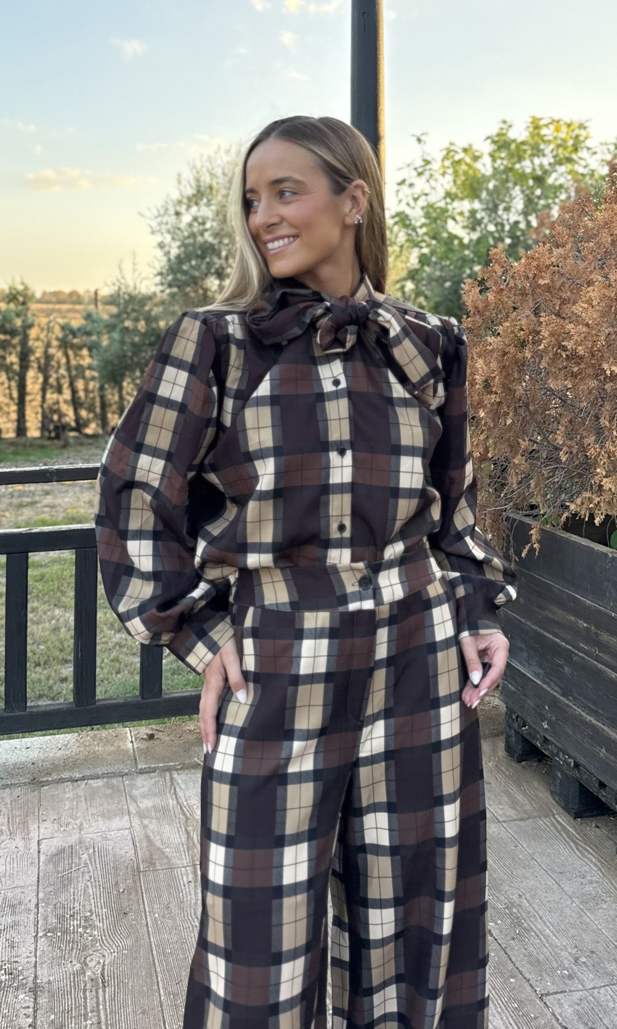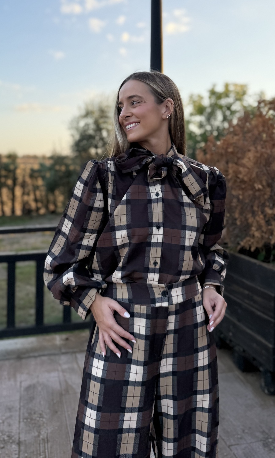 La blusa lleva botones y una lazada en el cuello que se puede cerrar o quedar suelta.