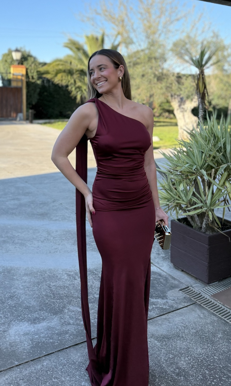 Vestido asimétrico con apertura en el lado izquierdo y una lazada larga en el lazo derecho.