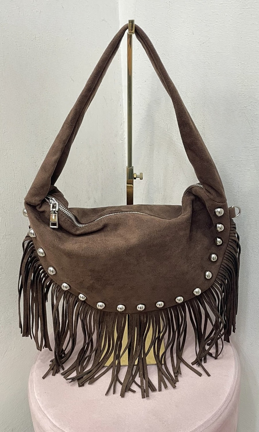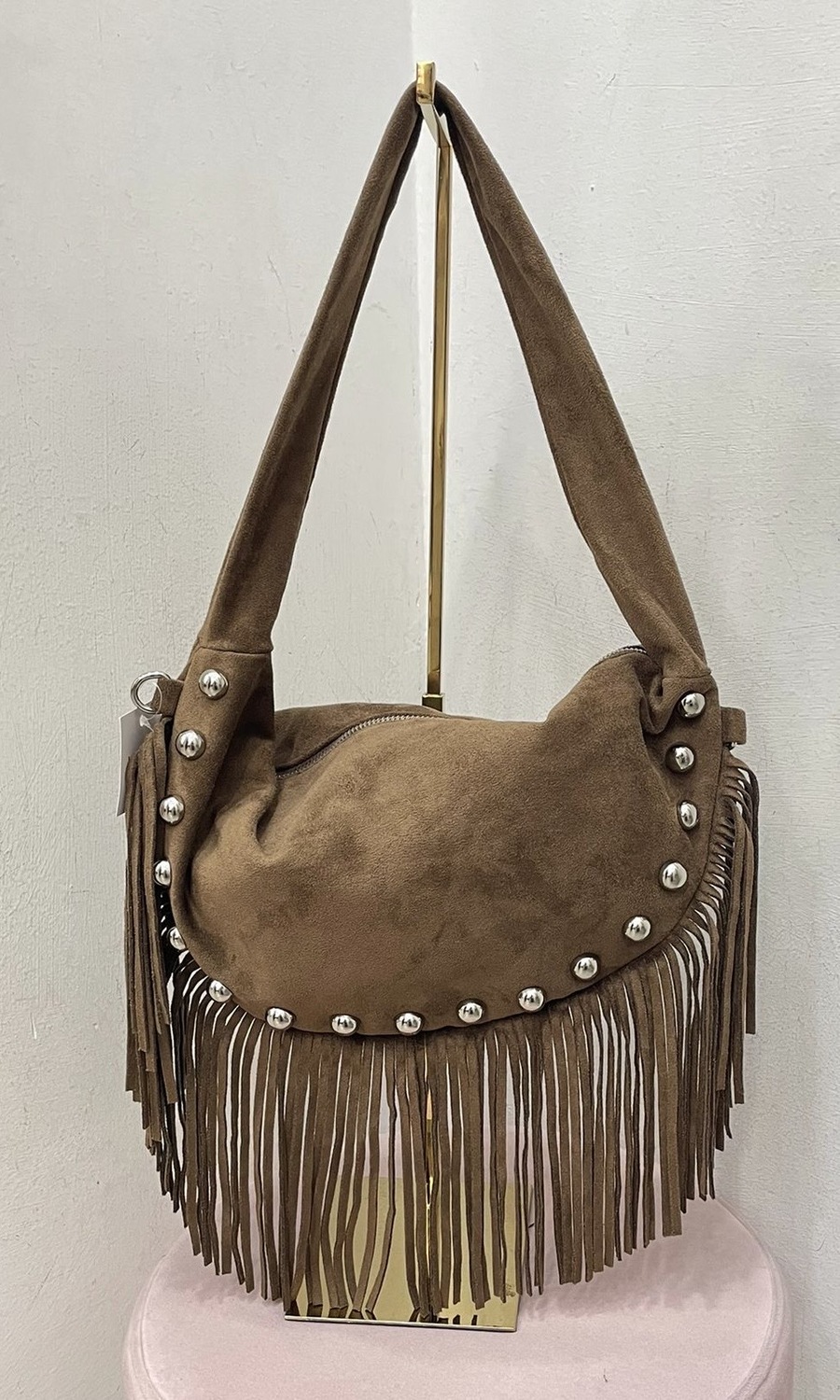 Bolso con flecos y tachuelas se puede colgar al hombro y también tiene cadena regulable.