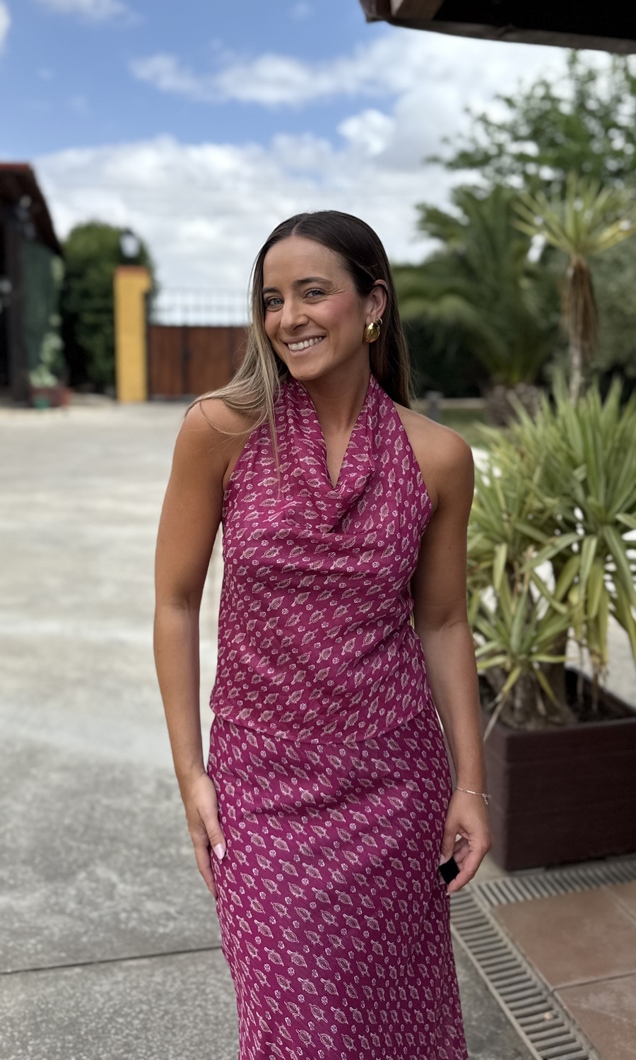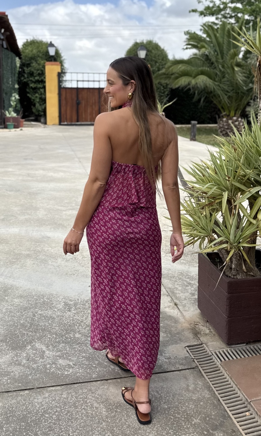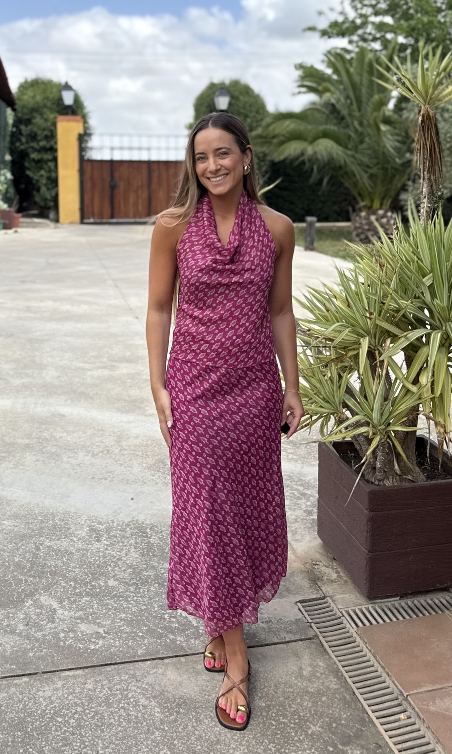 Conjunto de top y falda de gasa. Top cuello halter. La falda mide de largo 90 cm (aproximadamente).