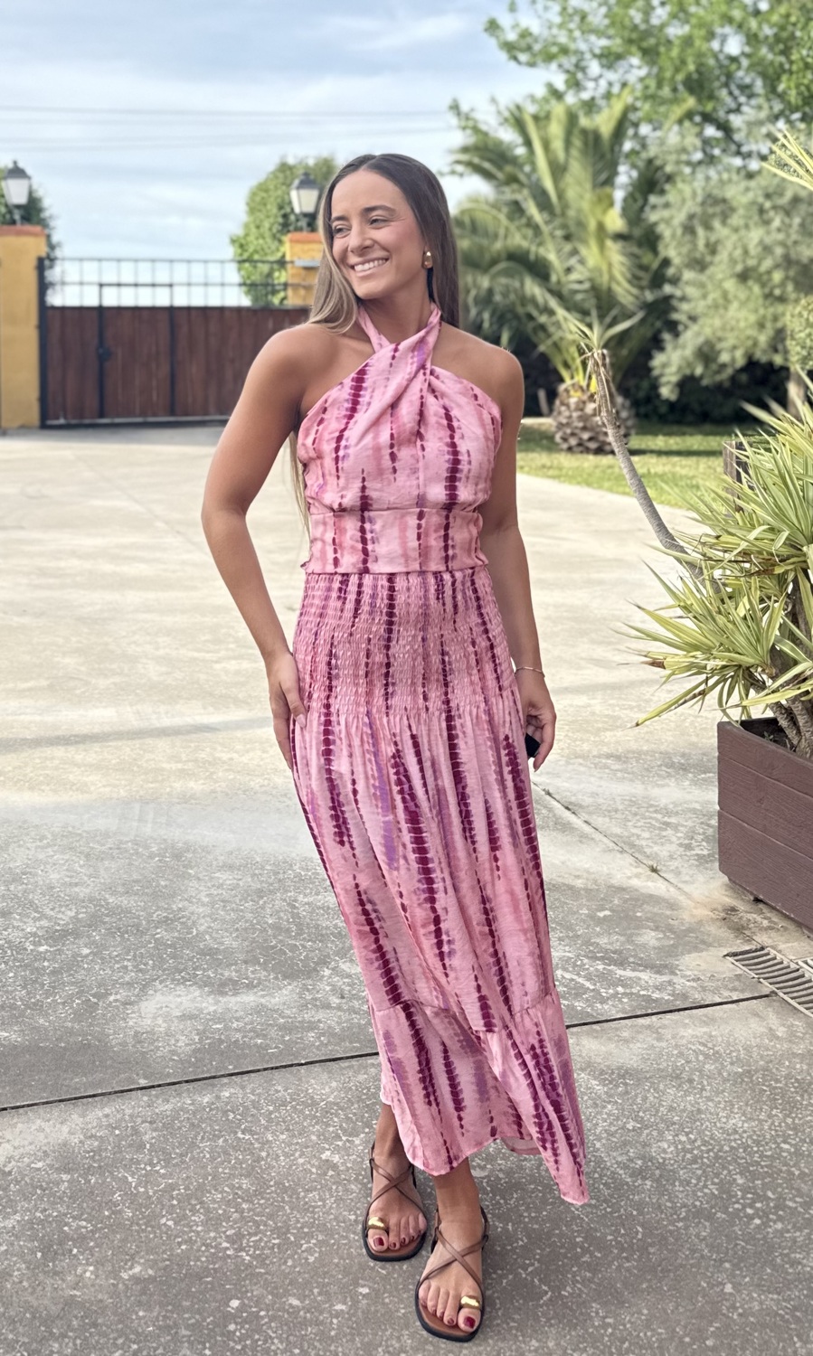 Conjunto de top y falda estampados. El top es cogido al cuello con nido de abeja en la espalda y la falda tiene vuelo y nido de abeja en la cintura.