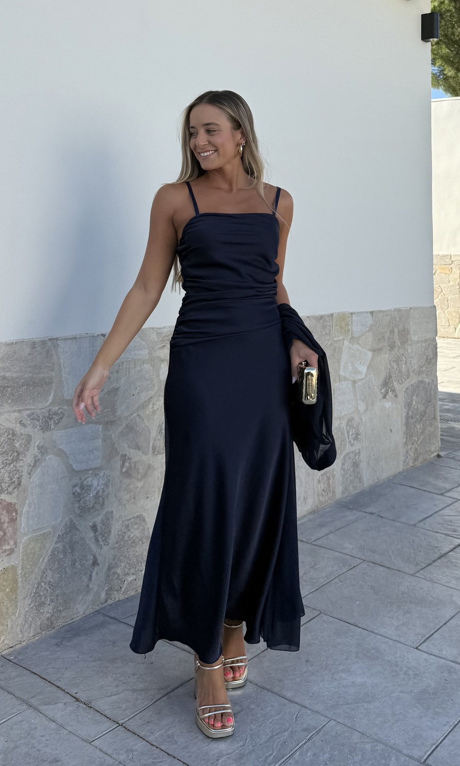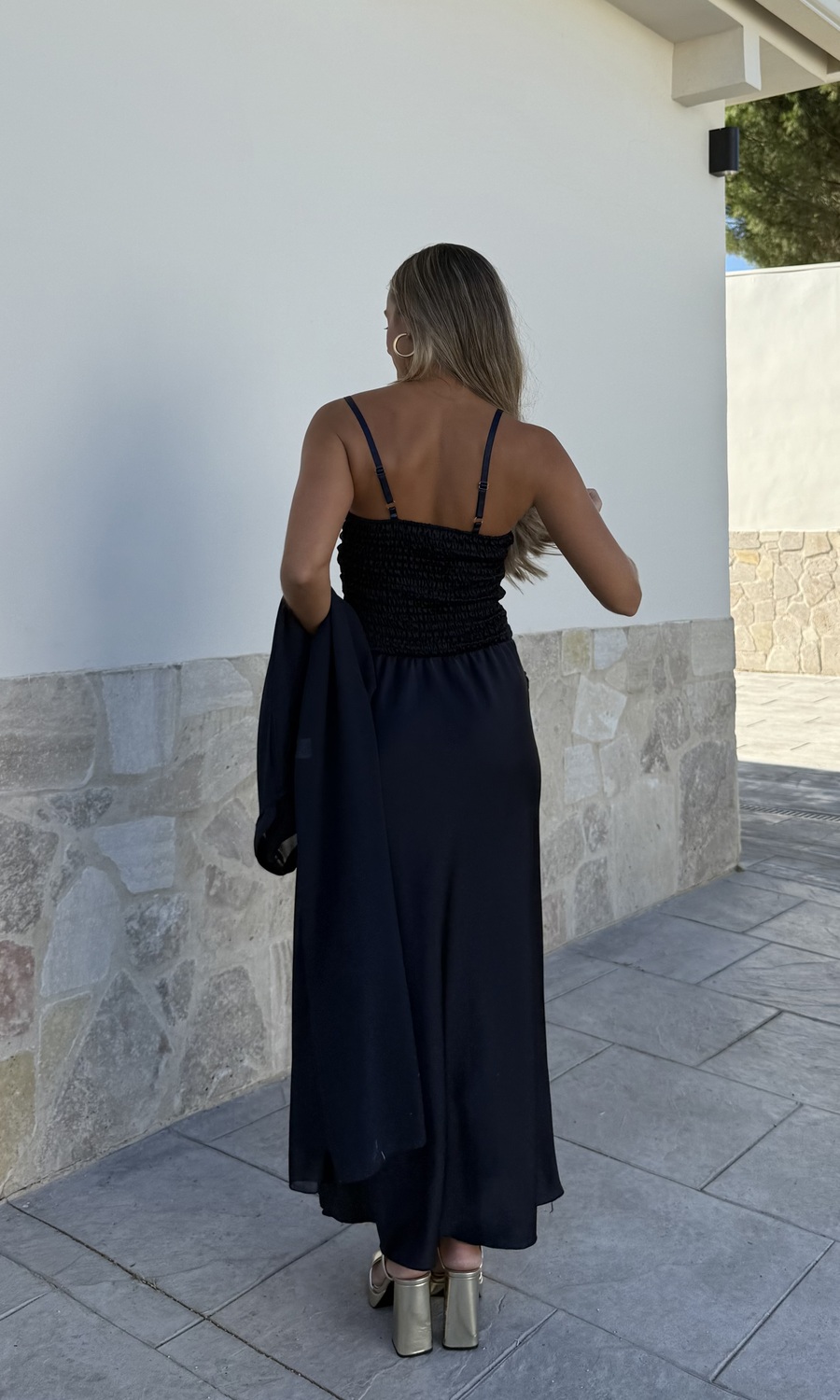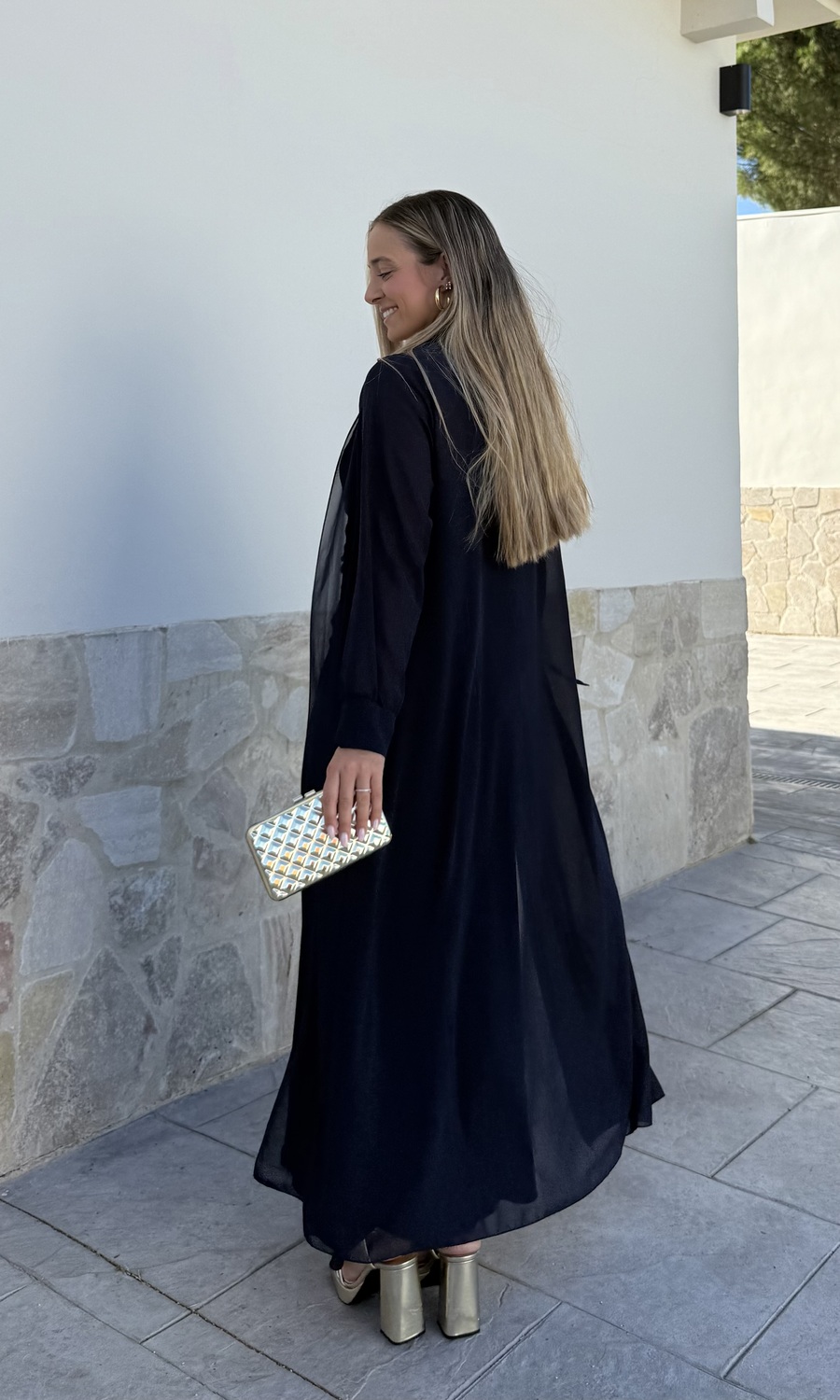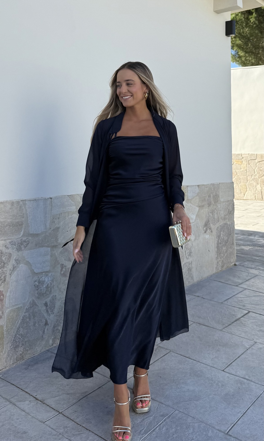 La capa de gasa larga se puede atar con una lazada delante. No incluye el vestido.