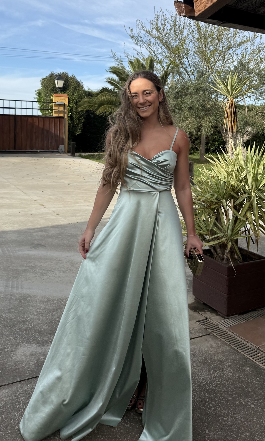 Vestido largo con apertura delantera, lleva tirantes regulables. Se puede utilizar palabra de honor recogiendo los tirantes. Lleva almohadilla en el pecho.