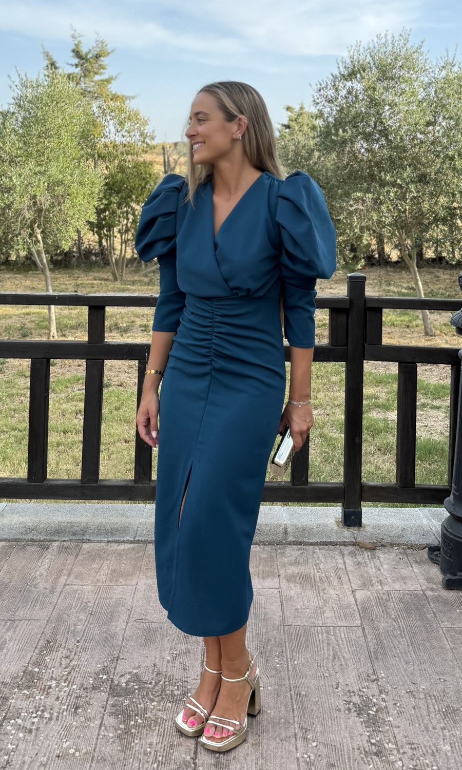 VESTIDO MANGA ABULLONADA PETRÓLEO