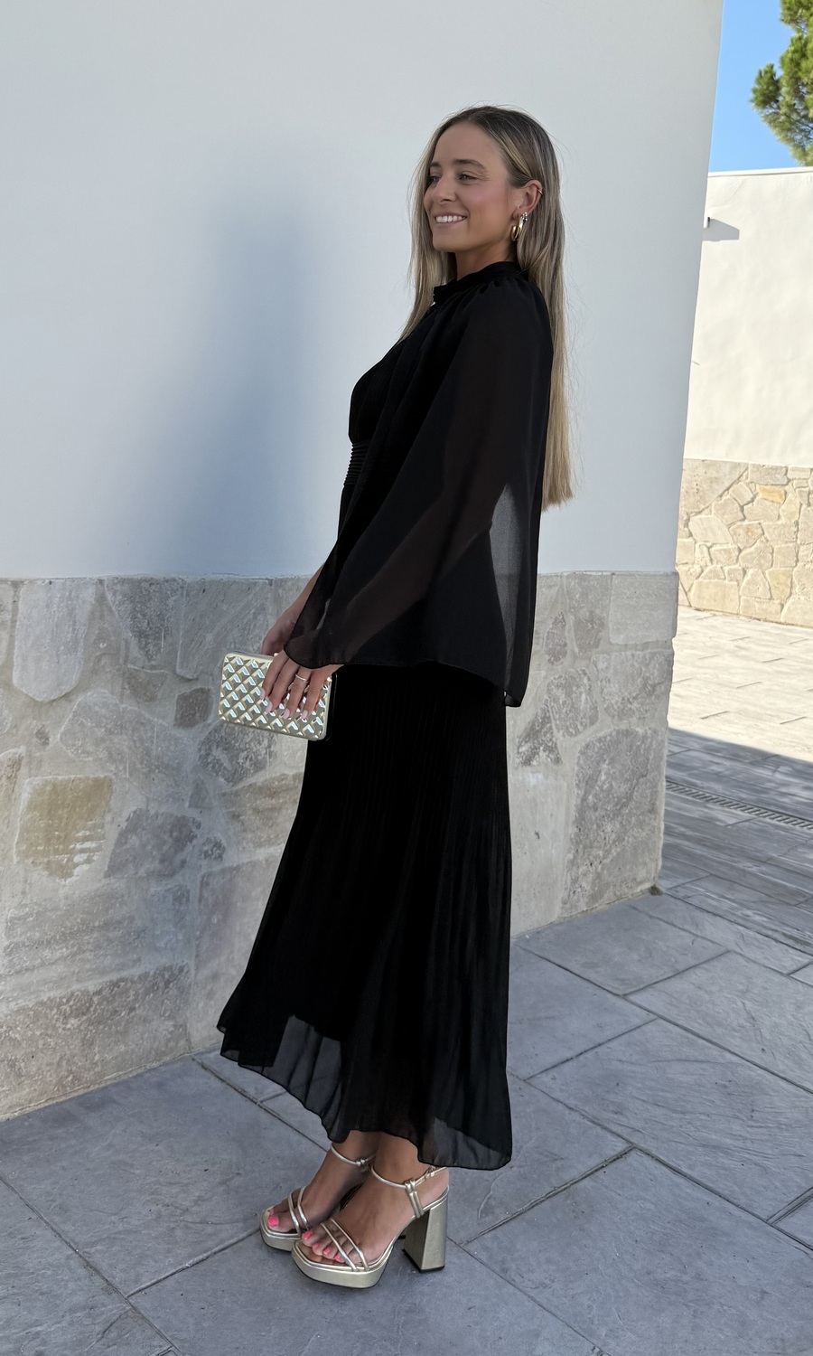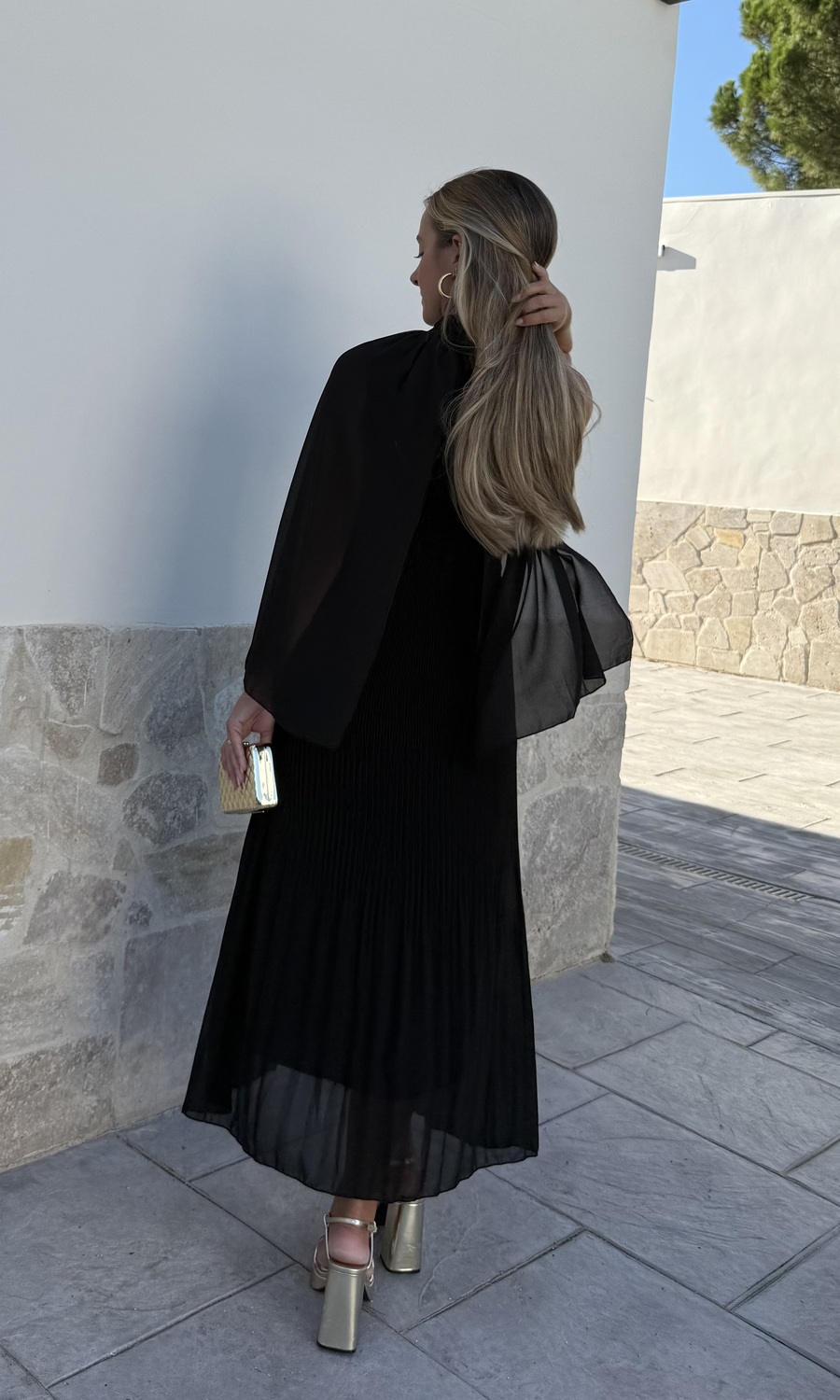 El vestido es plisado y lleva capa en los brazos que lo hace muy elegante para tu próximo evento este otoño/invierno.